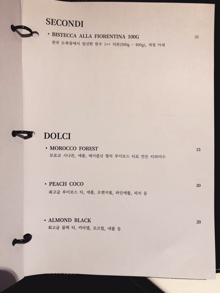 뒷장에는 SECONDI엔 스테이크(Steak) 와 후식이 나와있다.