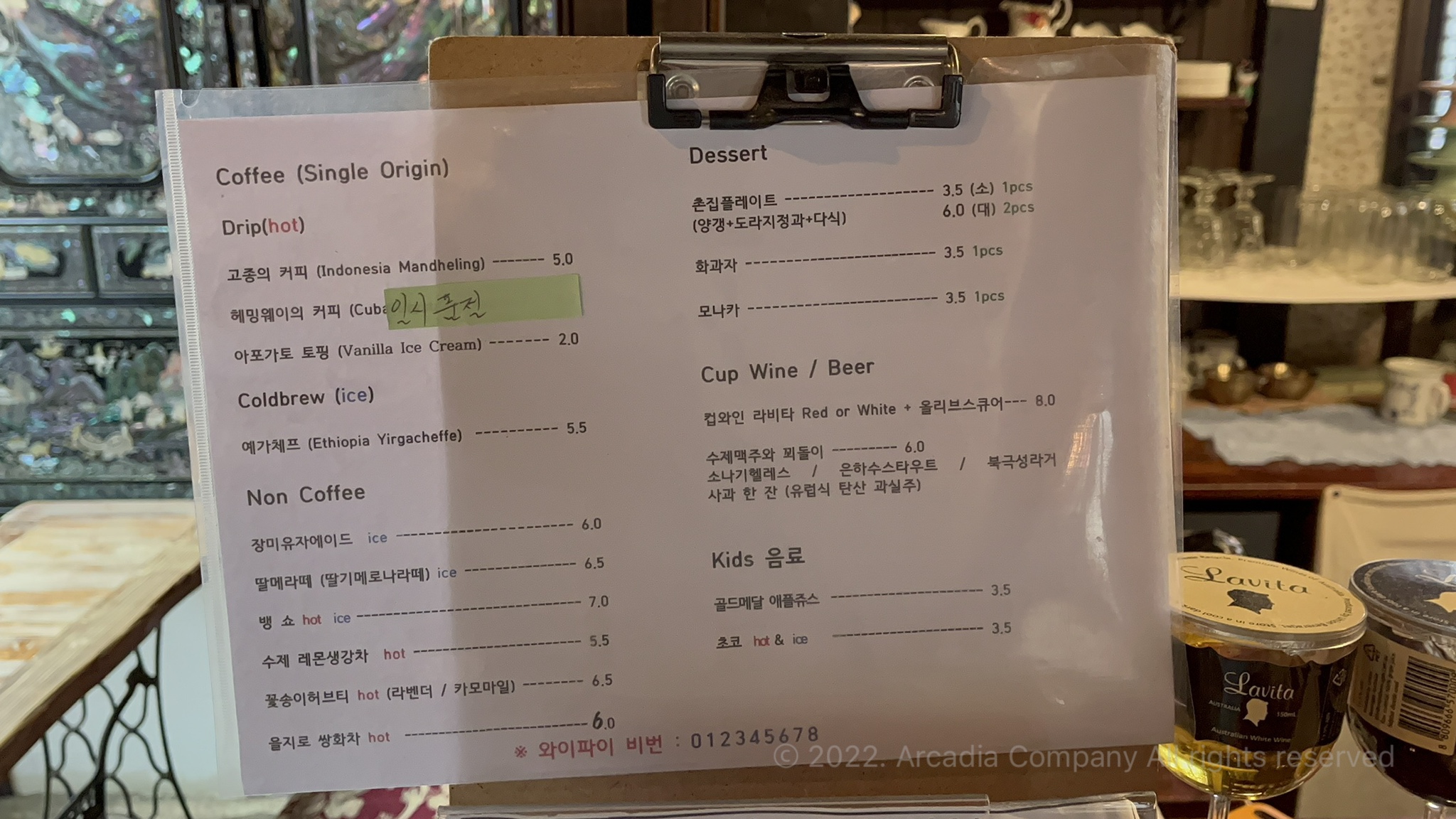 일반적인 메뉴가 아니라 커피 이름도 고종의 커피, 헤밍웨이의 커피.