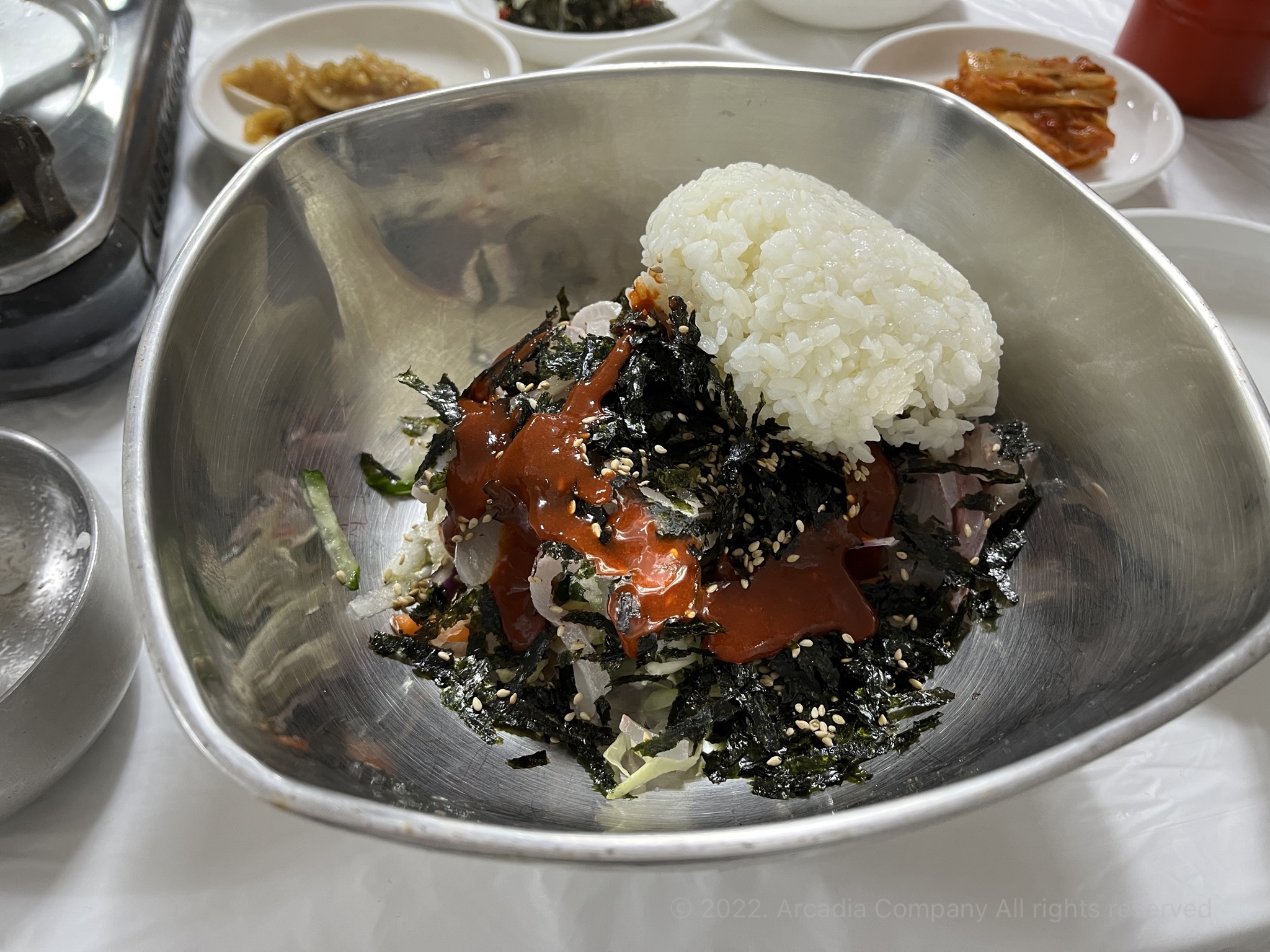 생선 구이도 먹을까하다가 아침이니까 밥을 먹자 생각하고 회덮밥을 시켰다.