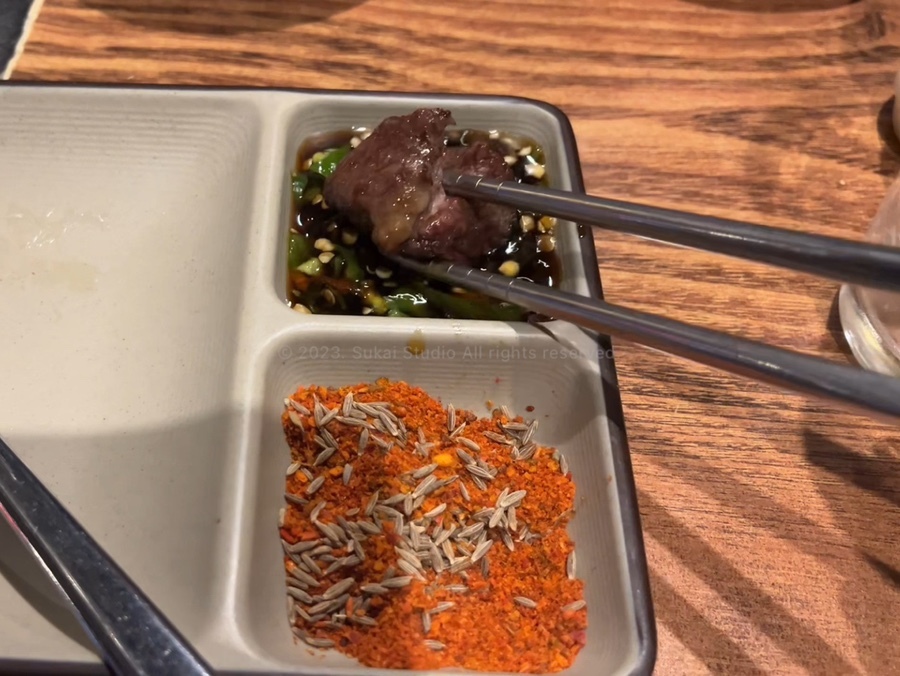 양꼬치를 먹을때는 간장+청양고추 소스를 찍고 밑에 쯔란+주황가루 를 찍어먹으면 아주 조화로운 맛이 난다.