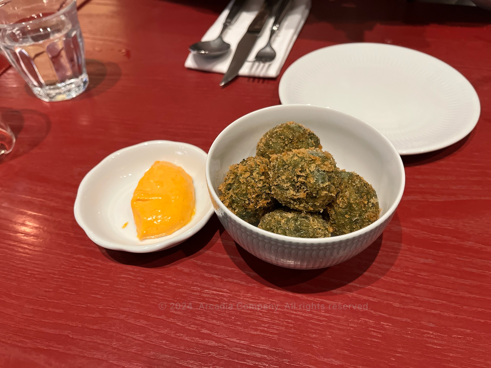 시금치 아란치니여서 초록색이었습니다. 같이 나온 소스는 노란색이라 뭔가 색깔이 잘 어울렸어요. 맛은 사실 딱 상상할 수 있는 맛. 아란치니를 제일 처음 먹었을 때는 정말 맛있게 먹었는데 저번에 데이빗앤룰스도 그렇고 점점 그 맛이 떨어지는 것 같아요. 그냥 튀긴 주먹밥이었습니다.