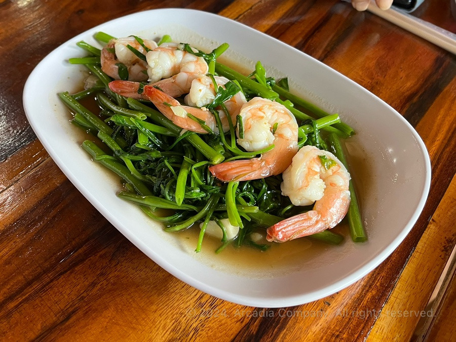 이건 새우를 곁들인 모닝글로리 (ผักบุ้งไฟแดง"กุ้ง A5 ไม่พ) 165바트