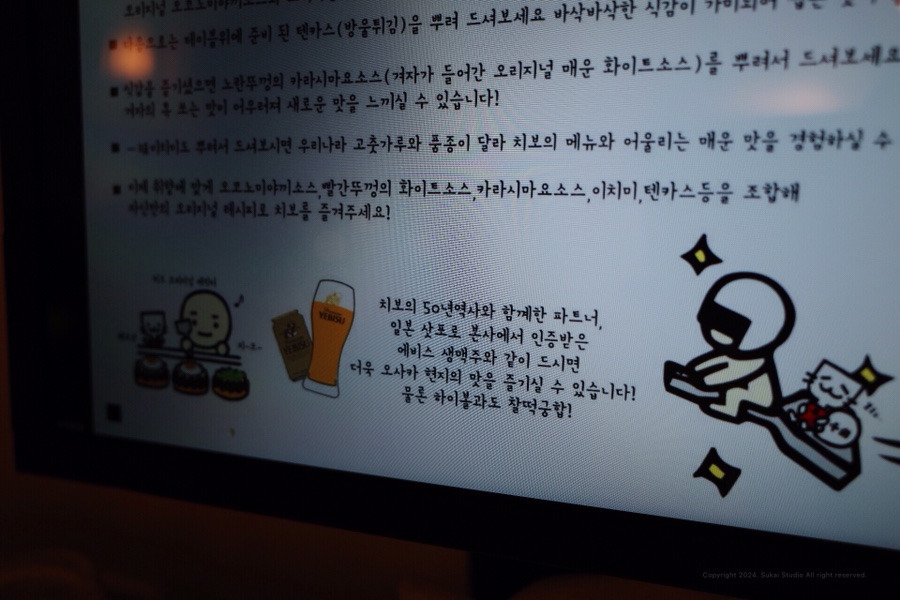 글귀로 치보 50년 역사와 함께 삿포로 본사에서 인증받은 에비스 생맥주라고 하니 안 시켜먹을 수 없었습니다.